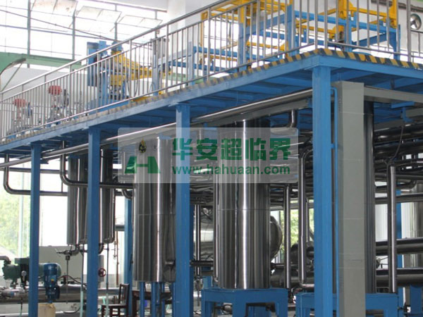 該裝置采用CO2作添加劑,主要應用:食品、醫藥、香精、香料等有效成份的提取,精細分離。裝置由萃取釜、分離釜、精餾柱、CO2泵等組成:萃取釜為0.5-50L/32-50Mpa固液兩用,CO2循環使用。接觸流體的容器、閥門、管路采用1Cr18Ni9Ti不銹鋼制作。
